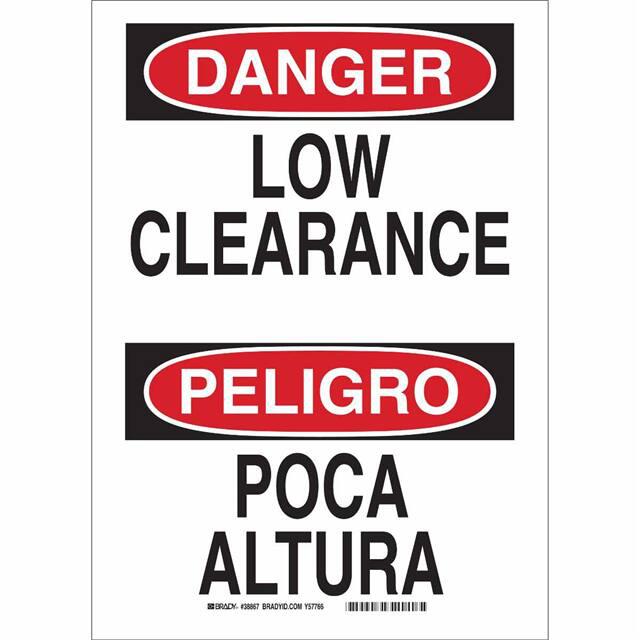 This is manufactured by Brady Corporation. The manufacturer part number is 38867. Label with a size of 14.00" l x 10.00" w (355.6mm x 254.0mm). The product is rohs3 compliant. It is assigned with possible HTSUS value of 3926.90.9985. It is shipped in bulk. It has a classic black and red legend, white background colour. The product brady®, is a highly preferred choice for users. The product is made from highly stable and reliable polyester. In addition, it is reach unaffected. Its typical moisture sensitivity level is not applicable. A bespoke label is a danger/peligro. low clearance/poca altura label. The product is suitable for use with danger. It has a long 4 weeks standard lead time. The product is designated with the ear99 code number