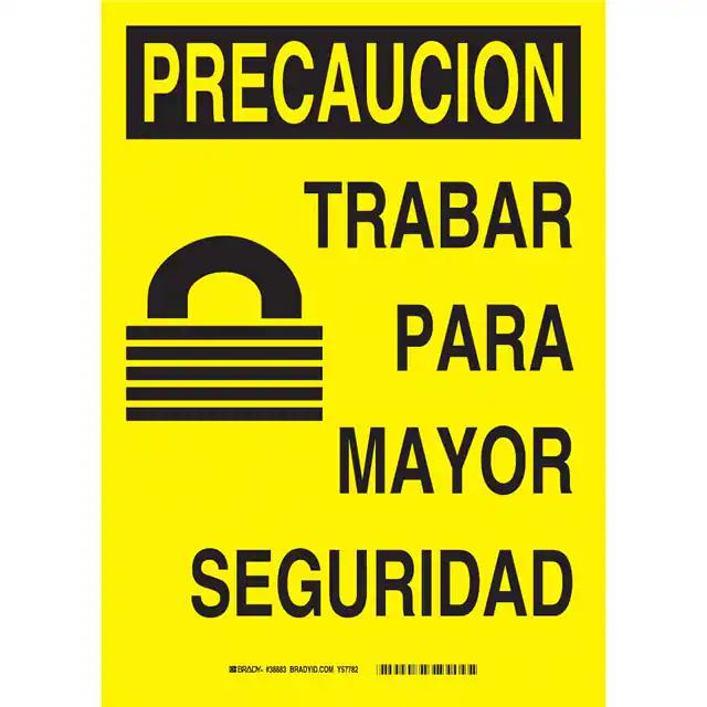 This is manufactured by Brady Corporation. The manufacturer part number is 38883. Label with a size of 14.00" l x 10.00" w (355.6mm x 254.0mm). The product is rohs3 compliant. It is assigned with possible HTSUS value of 3926.90.9985. It is shipped in bulk. It has a classic black legend, yellow background colour. The product brady®, is a highly preferred choice for users. The product is made from highly stable and reliable polyester. In addition, it is reach unaffected. Its typical moisture sensitivity level is not applicable. A bespoke label is a precaucion. trabar para mayor seguridad label. It has a long 4 weeks standard lead time. The product is designated with the ear99 code number