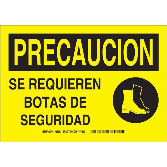 This is manufactured by Brady Corporation. The manufacturer part number is 38963. Label with a size of 10.00" l x 7.00" w (254.0mm x 177.8mm). The product is rohs3 compliant. It is assigned with possible HTSUS value of 3926.90.9985. It is shipped in bulk. It has a classic black legend, yellow background colour. The product brady®, is a highly preferred choice for users. The product is made from highly stable and reliable polyester. In addition, it is reach unaffected. Its typical moisture sensitivity level is not applicable. A bespoke label is a precaucion. se requieren botas de seguridad label. The product is suitable for use with caution. It has a long 4 weeks standard lead time. The product is designated with the ear99 code number