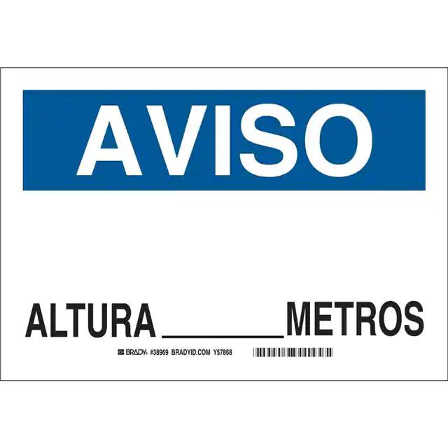 This is manufactured by Brady Corporation. The manufacturer part number is 38969. Label with a size of 14.00" l x 10.00" w (355.6mm x 254.0mm). The product is rohs3 compliant. It is assigned with possible HTSUS value of 3926.90.9985. It is shipped in bulk. It has a classic black and blue legend, white background colour. The product brady®, is a highly preferred choice for users. The product is made from highly stable and reliable polyester. In addition, it is reach unaffected. Its typical moisture sensitivity level is not applicable. A bespoke label is a aviso. altura. metros label. The product is suitable for use with notice. It has a long 4 weeks standard lead time. The product is designated with the ear99 code number