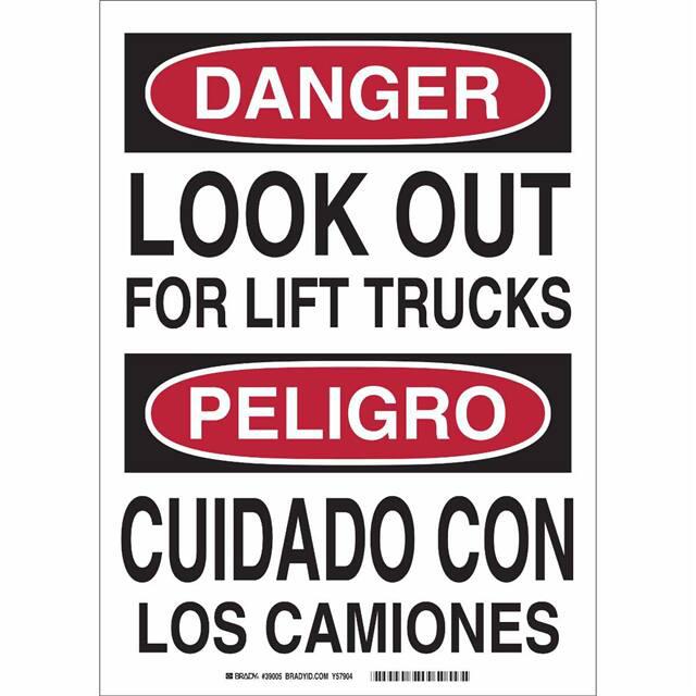 This is manufactured by Brady Corporation. The manufacturer part number is 39005. Label with a size of 14.00" l x 10.00" w (355.6mm x 254.0mm). The product is rohs3 compliant. It is assigned with possible HTSUS value of 3926.90.9985. It is shipped in bulk. It has a classic black and red legend, white background colour. The product brady®, is a highly preferred choice for users. The product is made from highly stable and reliable polyester. In addition, it is reach unaffected. Its typical moisture sensitivity level is not applicable. A bespoke label is a danger/peligro. look out for lift trucks/cuidado con los camiones label. The product is suitable for use with danger. It has a long 4 weeks standard lead time. The product is designated with the ear99 code number