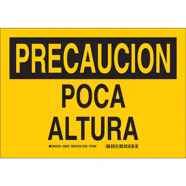 This is manufactured by Brady Corporation. The manufacturer part number is 39021. Label with a size of 10.00" l x 7.00" w (254.0mm x 177.8mm). The product is rohs3 compliant. It is assigned with possible HTSUS value of 3926.90.9985. It is shipped in bulk. It has a classic black legend, yellow background colour. The product brady®, is a highly preferred choice for users. The product is made from highly stable and reliable polyester. In addition, it is reach unaffected. Its typical moisture sensitivity level is not applicable. A bespoke label is a precaucion. poca altura label. The product is suitable for use with caution. It has a long 4 weeks standard lead time. The product is designated with the ear99 code number