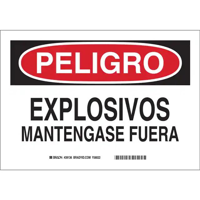 This is manufactured by Brady Corporation. The manufacturer part number is 39136. Label with a size of 14.00" l x 10.00" w (355.6mm x 254.0mm). The product is rohs3 compliant. It is assigned with possible HTSUS value of 3926.90.9985. It is shipped in bulk. It has a classic black and red legend, white background colour. The product brady®, is a highly preferred choice for users. The product is made from highly stable and reliable polyester. In addition, it is reach unaffected. Its typical moisture sensitivity level is not applicable. A bespoke label is a peligro. explosivos mantengase fuera label. The product is suitable for use with danger. It has a long 4 weeks standard lead time. The product is designated with the ear99 code number