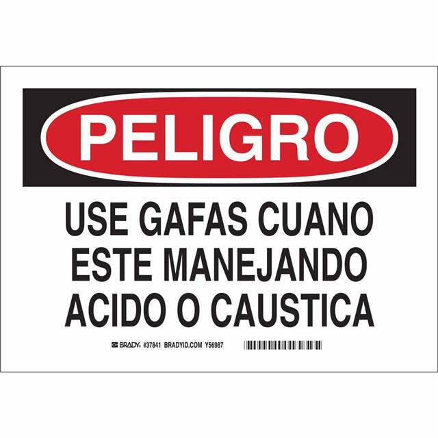 This is manufactured by Brady Corporation. The manufacturer part number is 39143. Label with a size of 14.00" l x 10.00" w (355.6mm x 254.0mm). The product is rohs3 compliant. It is assigned with possible HTSUS value of 3926.90.9985. It is shipped in bulk. It has a classic black and red legend, white background colour. The product brady®, is a highly preferred choice for users. The product is made from highly stable and reliable polyester. In addition, it is reach unaffected. Its typical moisture sensitivity level is not applicable. A bespoke label is a peligro. use gafas cuando este manejando acido o caustica label. The product is suitable for use with danger. It has a long 4 weeks standard lead time. The product is designated with the ear99 code number
