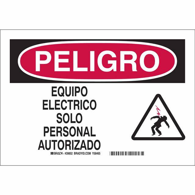 This is manufactured by Brady Corporation. The manufacturer part number is 39852. Label with a size of 10.00" l x 7.00" w (254.0mm x 177.8mm). The product is rohs3 compliant. It is assigned with possible HTSUS value of 3926.90.9985. It is shipped in bulk. It has a classic black and red legend, white background colour. The product brady®, is a highly preferred choice for users. The product is made from highly stable and reliable fiberglass. In addition, it is reach unaffected. Its typical moisture sensitivity level is not applicable. A bespoke label is a peligro. equipo electrico solo personal autorizado label. The product is suitable for use with danger. It has a long 4 weeks standard lead time. The product is designated with the ear99 code number