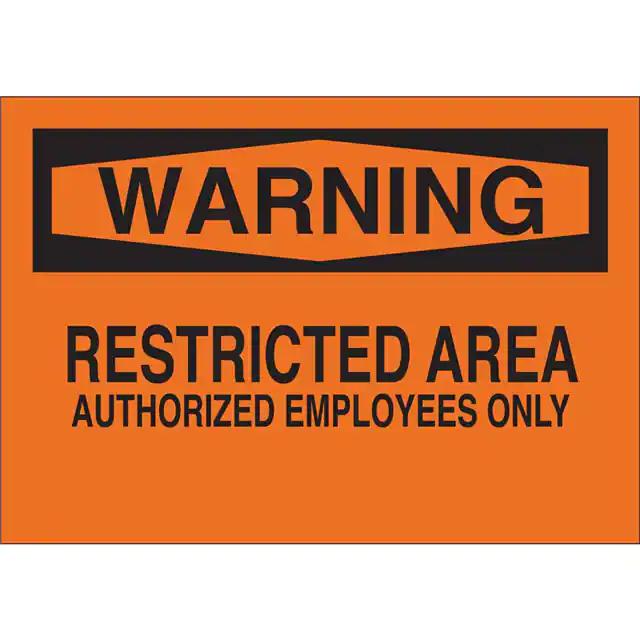 This is manufactured by Brady Corporation. The manufacturer part number is 40767. Label with a size of 10.00" l x 7.00" w (254.0mm x 177.8mm). The product is rohs3 compliant. It is assigned with possible HTSUS value of 8310.00.0000. It is shipped in bulk. It has a classic black legend, orange background colour. The product brady®, is a highly preferred choice for users. The product is made from highly stable and reliable aluminum. In addition, it is reach unaffected. Its typical moisture sensitivity level is not applicable. A bespoke label is a warning. restricted area authorized employees only label. The product is suitable for use with warning. It has a long 4 weeks standard lead time. The product is designated with the ear99 code number