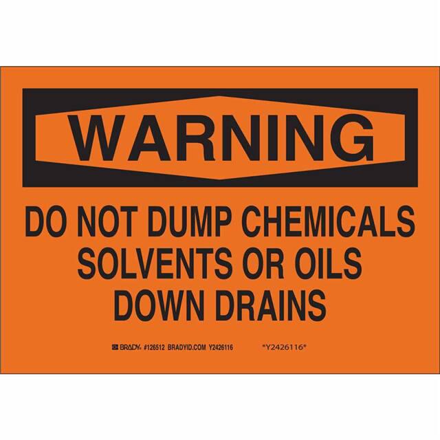 This is manufactured by Brady Corporation. The manufacturer part number is 40935. Label with a size of 10.00" l x 7.00" w (254.0mm x 177.8mm). The product is rohs3 compliant. It is assigned with possible HTSUS value of 8310.00.0000. It is shipped in bulk. It has a classic black legend, orange background colour. The product brady®, is a highly preferred choice for users. The product is made from highly stable and reliable aluminum. In addition, it is reach unaffected. Its typical moisture sensitivity level is not applicable. A bespoke label is a warning. do not dump chemicals solvents or oils down drains label. The product is suitable for use with warning. It has a long 4 weeks standard lead time. The product is designated with the ear99 code number