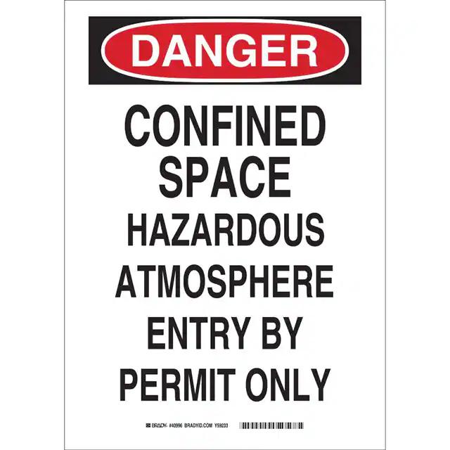 This is manufactured by Brady Corporation. The manufacturer part number is 40995. Label with a size of 10.00" l x 7.00" w (254.0mm x 177.8mm). The product is rohs3 compliant. It is assigned with possible HTSUS value of 8310.00.0000. It is shipped in bulk. It has a classic black and red legend, white background colour. The product brady®, is a highly preferred choice for users. The product is made from highly stable and reliable aluminum. In addition, it is reach unaffected. Its typical moisture sensitivity level is not applicable. A bespoke label is a danger. confined space hazardous atmosphere entry by permit only label. The product is suitable for use with danger. It has a long 4 weeks standard lead time. The product is designated with the ear99 code number