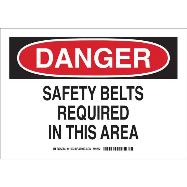 This is manufactured by Brady Corporation. The manufacturer part number is 41003. Label with a size of 10.00" l x 7.00" w (254.0mm x 177.8mm). The product is rohs3 compliant. It is assigned with possible HTSUS value of 8310.00.0000. It is shipped in bulk. It has a classic black and red legend, white background colour. The product brady®, is a highly preferred choice for users. The product is made from highly stable and reliable aluminum. In addition, it is reach unaffected. Its typical moisture sensitivity level is not applicable. A bespoke label is a danger. safety belts required in this area label. The product is suitable for use with danger. It has a long 4 weeks standard lead time. The product is designated with the ear99 code number