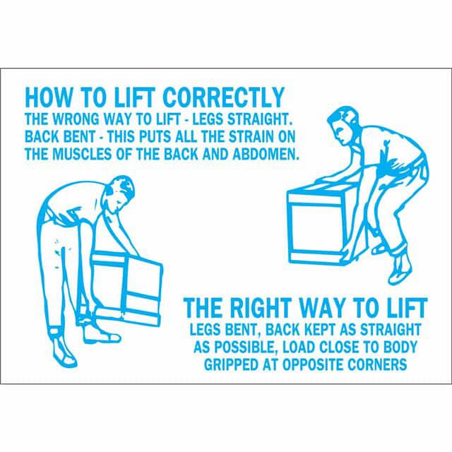 This is manufactured by Brady Corporation. The manufacturer part number is 41244. Label with a size of 10.00" l x 7.00" w (254.0mm x 177.8mm). The product is rohs3 compliant. It is assigned with possible HTSUS value of 8310.00.0000. It is shipped in bulk. It has a classic blue legend, white background colour. The product brady®, is a highly preferred choice for users. The product is made from highly stable and reliable aluminum. In addition, it is reach unaffected. Its typical moisture sensitivity level is not applicable. A bespoke label is a how to lift correctly the wrong way to lift - legs straight, back bent - this puts all the strain on the muscles of the back a… label. The product is suitable for use with warning. It has a long 4 weeks standard lead time. The product is designated with the ear99 code number