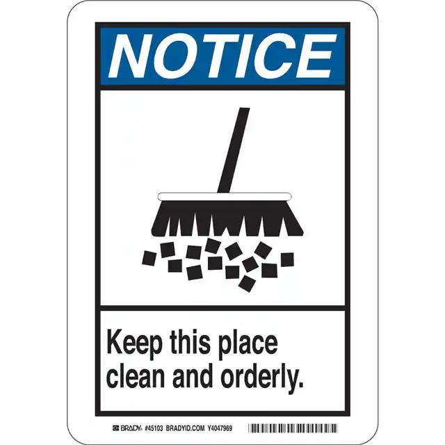 This is manufactured by Brady Corporation. The manufacturer part number is 45172. Label with a size of 14.00" l x 10.00" w (355.6mm x 254.0mm). The product is rohs3 compliant. It is assigned with possible HTSUS value of 3926.90.9985. It is shipped in bulk. It has a classic black and blue legend, white background colour. The product brady®, is a highly preferred choice for users. The product is made from highly stable and reliable polyester. In addition, it is reach unaffected. Its typical moisture sensitivity level is not applicable. A bespoke label is a notice. keep this place clean and orderly. label. The product is suitable for use with notice. It has a long 4 weeks standard lead time. The product is designated with the ear99 code number