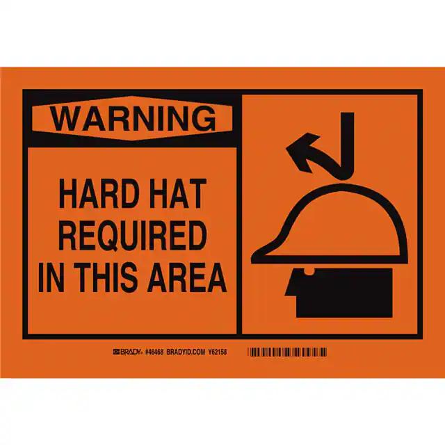 This is manufactured by Brady Corporation. The manufacturer part number is 46468. Label with a size of 10.00" l x 7.00" w (254.0mm x 177.8mm). The product is rohs3 compliant. It is assigned with possible HTSUS value of 8310.00.0000. It is shipped in bulk. It has a classic black legend, orange background colour. The product brady®, is a highly preferred choice for users. The product is made from highly stable and reliable aluminum. In addition, it is reach unaffected. Its typical moisture sensitivity level is not applicable. A bespoke label is a warning. hard hat required in this area label. The product is suitable for use with warning. It has a long 4 weeks standard lead time. The product is designated with the ear99 code number