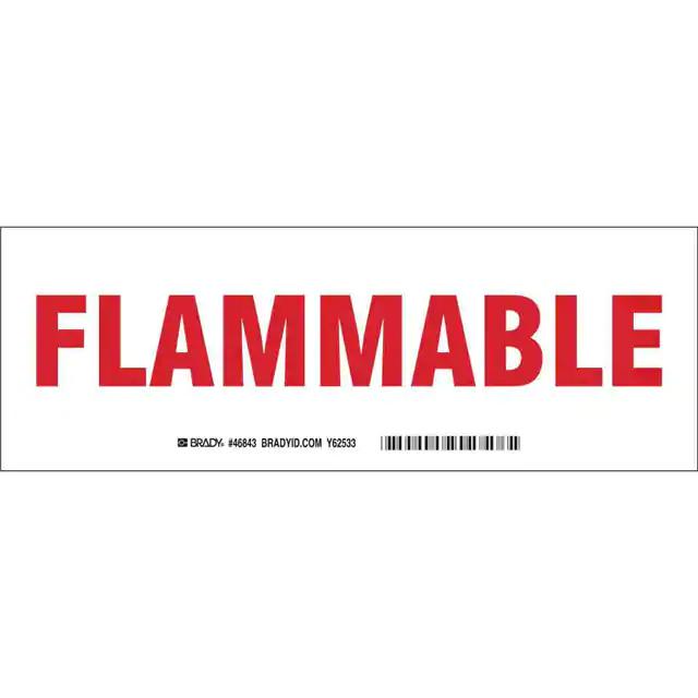 This is manufactured by Brady Corporation. The manufacturer part number is 46843. Label with a size of 10.00" l x 7.00" w (254.0mm x 177.8mm). The product is rohs3 compliant. It is assigned with possible HTSUS value of 8310.00.0000. It is shipped in bulk. It has a classic red legend, white background colour. The product brady®, is a highly preferred choice for users. The product is made from highly stable and reliable aluminum. In addition, it is reach unaffected. Its typical moisture sensitivity level is not applicable. A bespoke label is a flammable label. The product is suitable for use with warning. It has a long 4 weeks standard lead time. The product is designated with the ear99 code number