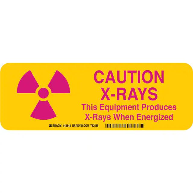 This is manufactured by Brady Corporation. The manufacturer part number is 46848. Label with a size of 10.00" l x 3.50" w (254.0mm x 88.9mm). The product is rohs3 compliant. It is assigned with possible HTSUS value of 8310.00.0000. It is shipped in bulk. It has a classic magenta legend, yellow background colour. The product brady®, is a highly preferred choice for users. The product is made from highly stable and reliable aluminum. In addition, it is reach unaffected. Its typical moisture sensitivity level is not applicable. A bespoke label is a caution x-rays this equipment produces x-rays when energized label. The product is suitable for use with caution. It has a long 4 weeks standard lead time. The product is designated with the ear99 code number