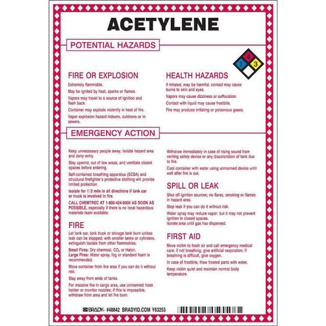 This is manufactured by Brady Corporation. The manufacturer part number is 48842. Label with a size of 10.00" l x 7.00" w (254.0mm x 177.8mm). The product is rohs3 compliant. It is assigned with possible HTSUS value of 3926.90.9985. It is shipped in bulk. It has a classic black, blue, red and yellow legend, white background colour. The product brady®, is a highly preferred choice for users. The product is made from highly stable and reliable fiberglass. In addition, it is reach unaffected. Its typical moisture sensitivity level is not applicable. A bespoke label is a acetylene potential hazards label. The product is suitable for use with warning. It has a long 4 weeks standard lead time. The product is designated with the ear99 code number