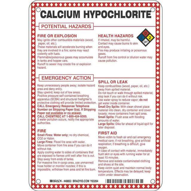 This is manufactured by Brady Corporation. The manufacturer part number is 48853. Label with a size of 10.00" l x 7.00" w (254.0mm x 177.8mm). The product is rohs3 compliant. It is assigned with possible HTSUS value of 3926.90.9985. It is shipped in bulk. It has a classic black, blue, red and yellow legend, white background colour. The product brady®, is a highly preferred choice for users. The product is made from highly stable and reliable fiberglass. In addition, it is reach unaffected. Its typical moisture sensitivity level is not applicable. A bespoke label is a calcium hypochlorite potential hazards label. The product is suitable for use with warning. It has a long 4 weeks standard lead time. The product is designated with the ear99 code number