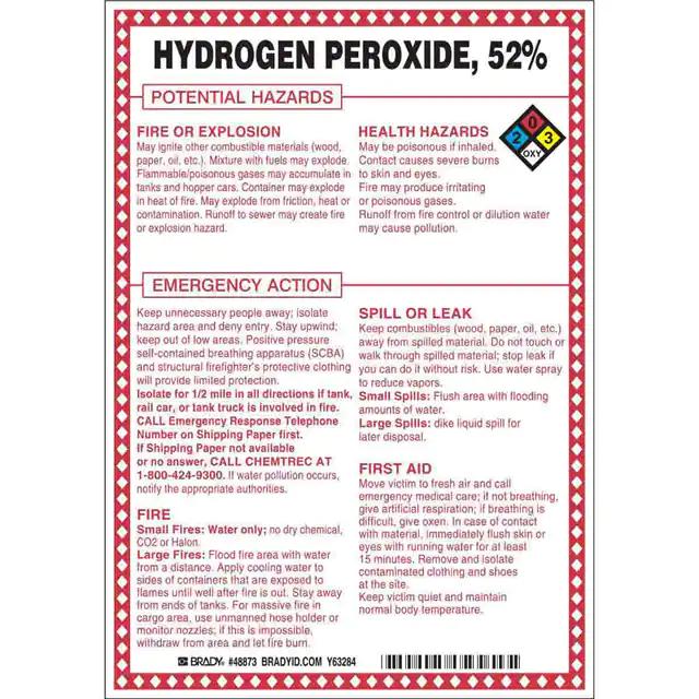 This is manufactured by Brady Corporation. The manufacturer part number is 48873. Label with a size of 10.00" l x 7.00" w (254.0mm x 177.8mm). The product is rohs3 compliant. It is assigned with possible HTSUS value of 3926.90.9985. It is shipped in bulk. It has a classic black and red legend, white background colour. The product brady®, is a highly preferred choice for users. The product is made from highly stable and reliable fiberglass. In addition, it is reach unaffected. Its typical moisture sensitivity level is not applicable. A bespoke label is a hydrogen peroxide, 52% potential hazards label. The product is suitable for use with warning. It has a long 4 weeks standard lead time. The product is designated with the ear99 code number