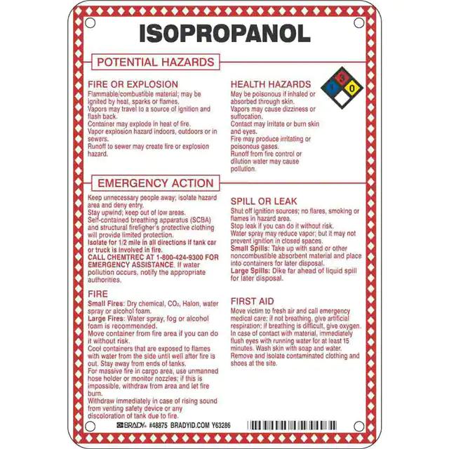 This is manufactured by Brady Corporation. The manufacturer part number is 48875. Label with a size of 10.00" l x 7.00" w (254.0mm x 177.8mm). The product is rohs3 compliant. It is assigned with possible HTSUS value of 3926.90.9985. It is shipped in bulk. It has a classic black, blue, red and yellow legend, white background colour. The product brady®, is a highly preferred choice for users. The product is made from highly stable and reliable fiberglass. In addition, it is reach unaffected. Its typical moisture sensitivity level is not applicable. A bespoke label is a isopropanol potential hazards label. The product is suitable for use with warning. It has a long 4 weeks standard lead time. The product is designated with the ear99 code number