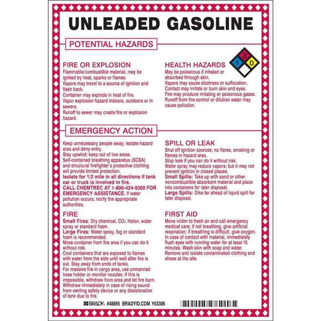 This is manufactured by Brady Corporation. The manufacturer part number is 48895. Label with a size of 10.00" l x 7.00" w (254.0mm x 177.8mm). The product is rohs3 compliant. It is assigned with possible HTSUS value of 3926.90.9985. It is shipped in bulk. It has a classic black, blue, red and yellow legend, white background colour. The product brady®, is a highly preferred choice for users. The product is made from highly stable and reliable fiberglass. In addition, it is reach unaffected. Its typical moisture sensitivity level is not applicable. A bespoke label is a unleaded gasoline potential hazards label. The product is suitable for use with warning. It has a long 4 weeks standard lead time. The product is designated with the ear99 code number
