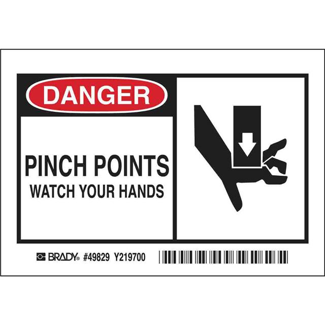 This is manufactured by Brady Corporation. The manufacturer part number is 49829. Label with a size of 5.00" l x 3.50" w (127.0mm x 88.9mm). The product is rohs3 compliant. It is assigned with possible HTSUS value of 3926.90.9985. It is shipped in bulk. It has a classic black and red legend, white background colour. The product brady®, is a highly preferred choice for users. The product is made from highly stable and reliable polyester. In addition, it is reach unaffected. Its typical moisture sensitivity level is not applicable. A bespoke label is a danger. pinch points watch your hands label. The product is suitable for use with danger. It has a long 4 weeks standard lead time. The product is designated with the ear99 code number