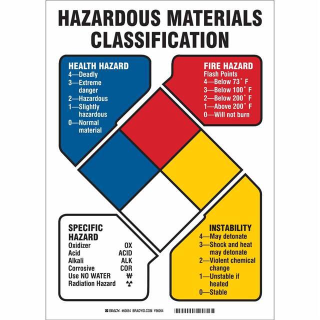 This is manufactured by Brady Corporation. The manufacturer part number is 60054. Label with a size of 14.00" l x 10.00" w (355.6mm x 254.0mm). The product is rohs3 compliant. It is assigned with possible HTSUS value of 3926.90.9985. It is shipped in bulk. It has a classic black, blue, red and yellow legend, white background colour. The product brady®, is a highly preferred choice for users. The product is made from highly stable and reliable polyester. In addition, it is reach unaffected. Its typical moisture sensitivity level is not applicable. A bespoke label is a hazardous materials classification label. The product is suitable for use with warning. It has a long 4 weeks standard lead time. The product is designated with the ear99 code number