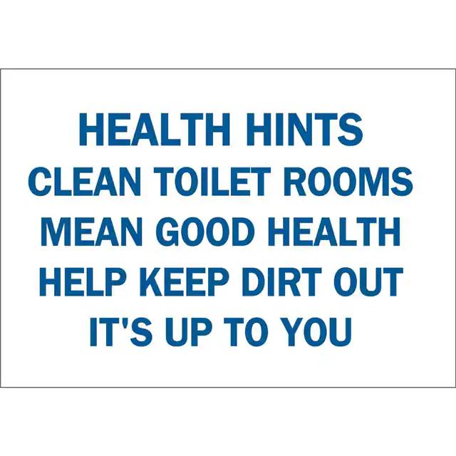 This is manufactured by Brady Corporation. The manufacturer part number is 69008. Label with a size of 14.00" l x 10.00" w (355.6mm x 254.0mm). The product is rohs3 compliant. It is assigned with possible HTSUS value of 3926.90.9985. It is shipped in bulk. It has a classic blue legend, white background colour. The product brady®, is a highly preferred choice for users. The product is made from highly stable and reliable fiberglass. In addition, it is reach unaffected. Its typical moisture sensitivity level is not applicable. A bespoke label is a health hints clean toilet rooms mean good health help keep dirt out it's up to you label. The product is suitable for use with warning. It has a long 4 weeks standard lead time. The product is designated with the ear99 code number