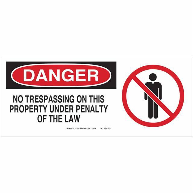 This is manufactured by Brady Corporation. The manufacturer part number is 70456. Label with a size of 17.00" l x 7.00" w (431.8mm x 177.8mm). The product is rohs3 compliant. It is assigned with possible HTSUS value of 3926.90.9985. It is shipped in bulk. It has a classic black and red legend, white background colour. The product brady®, is a highly preferred choice for users. The product is made from highly stable and reliable fiberglass. In addition, it is reach unaffected. Its typical moisture sensitivity level is not applicable. A bespoke label is a danger. no trespassing on this property under penalty of the law label. The product is suitable for use with danger. It has a long 4 weeks standard lead time. The product is designated with the ear99 code number