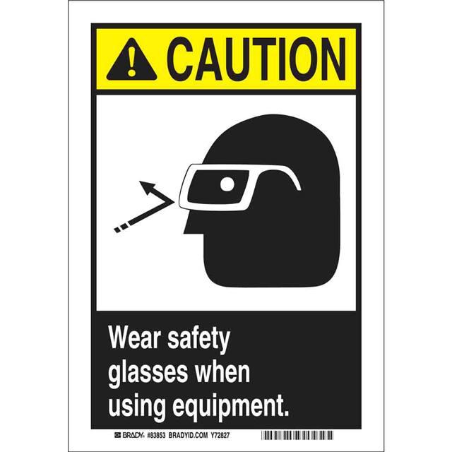 This is manufactured by Brady Corporation. The manufacturer part number is 83853. Label with a size of 10.00" l x 7.00" w (254.0mm x 177.8mm). The product is rohs3 compliant. It is assigned with possible HTSUS value of 3926.90.9985. It is shipped in bulk. It has a classic black and yellow legend, white background colour. The product brady®, is a highly preferred choice for users. The product is made from highly stable and reliable polyester. In addition, it is reach unaffected. Its typical moisture sensitivity level is not applicable. A bespoke label is a caution. wear safety glasses when using equipment. label. The product is suitable for use with caution. It has a long 4 weeks standard lead time. The product is designated with the ear99 code number