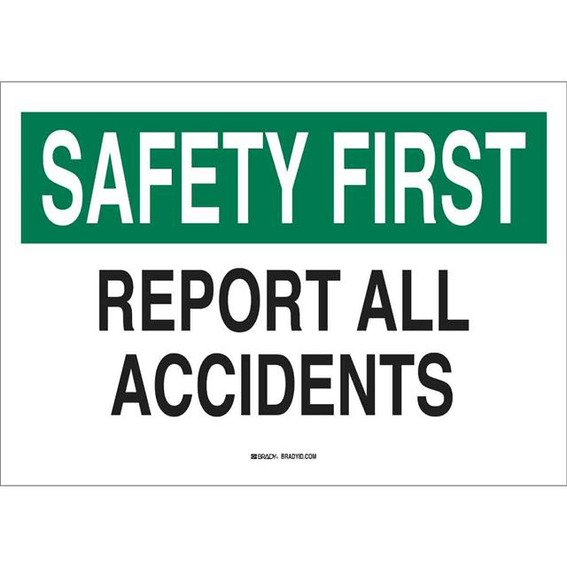 This is manufactured by Brady Corporation. The manufacturer part number is 87682. Label with a size of 10.00" l x 7.00" w (254.0mm x 177.8mm). The product is rohs3 compliant. It is assigned with possible HTSUS value of 3926.90.9985. It is shipped in bulk. It has a classic black and green legend, white background colour. The product brady®, is a highly preferred choice for users. The product is made from highly stable and reliable fiberglass. In addition, it is reach unaffected. Its typical moisture sensitivity level is not applicable. A bespoke label is a safety first. report all accidents label. The product is suitable for use with safety. It has a long 4 weeks standard lead time. The product is designated with the ear99 code number