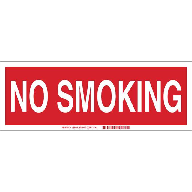 This is manufactured by Brady Corporation. The manufacturer part number is 88418. Label with a size of 14.00" l x 5.00" w (355.6mm x 127.0mm). It is assigned with possible HTSUS value of 3926.90.9985. It is shipped in bulk. It has a classic white legend, red background colour. The product brady®, is a highly preferred choice for users. The product is made from highly stable and reliable polyester. In addition, it is reach unaffected. Its typical moisture sensitivity level is not applicable. A bespoke label is a no smoking label. The product is suitable for use with warning. It has a long 4 weeks standard lead time. The product is designated with the ear99 code number