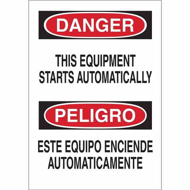 This is manufactured by Brady Corporation. The manufacturer part number is 90795. Label with a size of 14.00" l x 10.00" w (355.6mm x 254.0mm). The product is rohs3 compliant. It is assigned with possible HTSUS value of 3926.90.9985. It is shipped in bulk. It has a classic black and red legend, white background colour. The product brady®, is a highly preferred choice for users. The product is made from highly stable and reliable polyester. In addition, it is reach unaffected. Its typical moisture sensitivity level is not applicable. A bespoke label is a danger/peligro. this equipment starts automatically/este equipo enciende automaticamente label. The product is suitable for use with danger. It has a long 4 weeks standard lead time. The product is designated with the ear99 code number