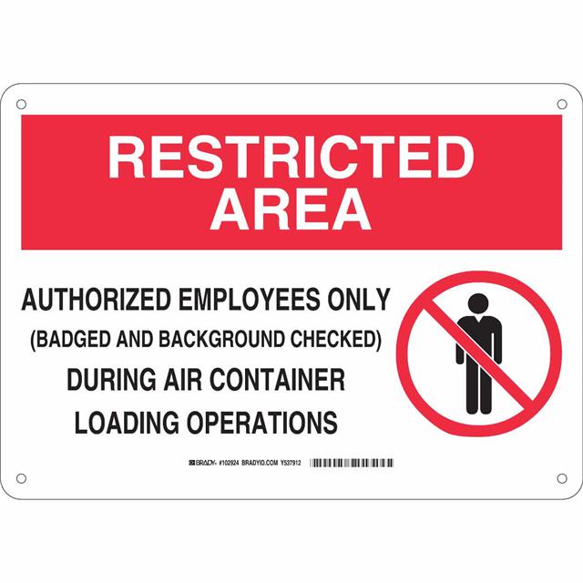 This is manufactured by Brady Corporation. The manufacturer part number is 102924. Label with a size of 14.00" l x 10.00" w (355.6mm x 254.0mm). The product is rohs3 compliant. It is assigned with possible HTSUS value of 8310.00.0000. It is shipped in bulk. It has a classic black and red legend, white background colour. The product brady®, is a highly preferred choice for users. The product is made from highly stable and reliable aluminum. In addition, it is reach unaffected. Its typical moisture sensitivity level is not applicable. A bespoke label is a restricted area. authorized employees only (badged and background checked) during air container loading operations label. The product is suitable for use with warning. It has a long 4 weeks standard lead time. The product is designated with the ear99 code number