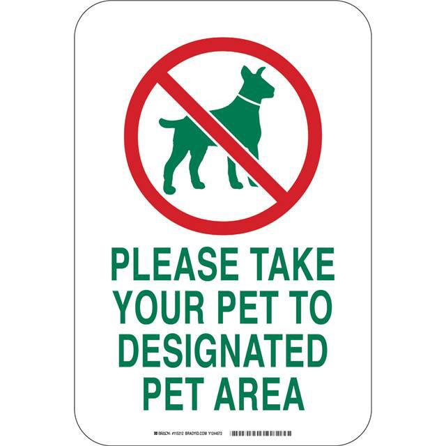 This is manufactured by Brady Corporation. The manufacturer part number is 115212. Label with a size of 18.00" l x 12.00" w (457.2mm x 304.8mm). The product is rohs3 compliant. It is assigned with possible HTSUS value of 8310.00.0000. It is shipped in bulk. It has a classic green and red legend, white background colour. The product brady®, is a highly preferred choice for users. The product is made from highly stable and reliable aluminum. In addition, it is reach unaffected. Its typical moisture sensitivity level is not applicable. A bespoke label is a please. take your pet to designated pet area label. The product is suitable for use with warning. It has a long 4 weeks standard lead time. The product is designated with the ear99 code number