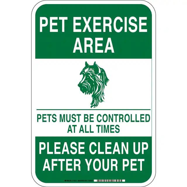 This is manufactured by Brady Corporation. The manufacturer part number is 115217. Label with a size of 18.00" l x 12.00" w (457.2mm x 304.8mm). The product is rohs3 compliant. It is assigned with possible HTSUS value of 8310.00.0000. It is shipped in bulk. It has a classic green legend, white background colour. The product brady®, is a highly preferred choice for users. The product is made from highly stable and reliable aluminum. In addition, it is reach unaffected. Its typical moisture sensitivity level is not applicable. A bespoke label is a pet exercise area pets must be controlled at all times please clean up after your pet label. The product is suitable for use with notice. It has a long 4 weeks standard lead time. The product is designated with the ear99 code number