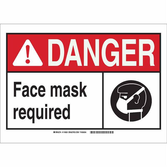 This is manufactured by Brady Corporation. The manufacturer part number is 119929. Label with a size of 14.00" l x 10.00" w (355.6mm x 254.0mm). The product is rohs3 compliant. It is assigned with possible HTSUS value of 3926.90.9985. It is shipped in bulk. It has a classic black and red legend, glow background colour. The product brady®, is a highly preferred choice for users. The product is made from highly stable and reliable polyester. In addition, it is reach unaffected. Its typical moisture sensitivity level is not applicable. A bespoke label is a danger. face mask required label. It has a long 4 weeks standard lead time. The product is designated with the ear99 code number