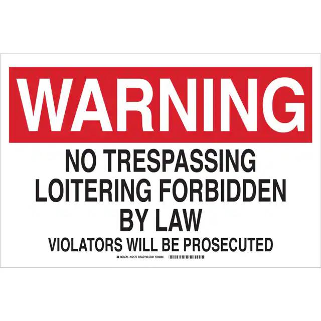 This is manufactured by Brady Corporation. The manufacturer part number is 12181. Label with a size of 18.00" l x 12.00" w (457.2mm x 304.8mm). The product is rohs3 compliant. It is assigned with possible HTSUS value of 8310.00.0000. It is shipped in bulk. It has a classic black and red legend, white background colour. The product brady®, is a highly preferred choice for users. The product is made from highly stable and reliable aluminum. In addition, it is reach unaffected. Its typical moisture sensitivity level is not applicable. A bespoke label is a warning. no trespassing loitering forbidden by law violators will be prosecuted label. It has a long 4 weeks standard lead time. The product is designated with the ear99 code number