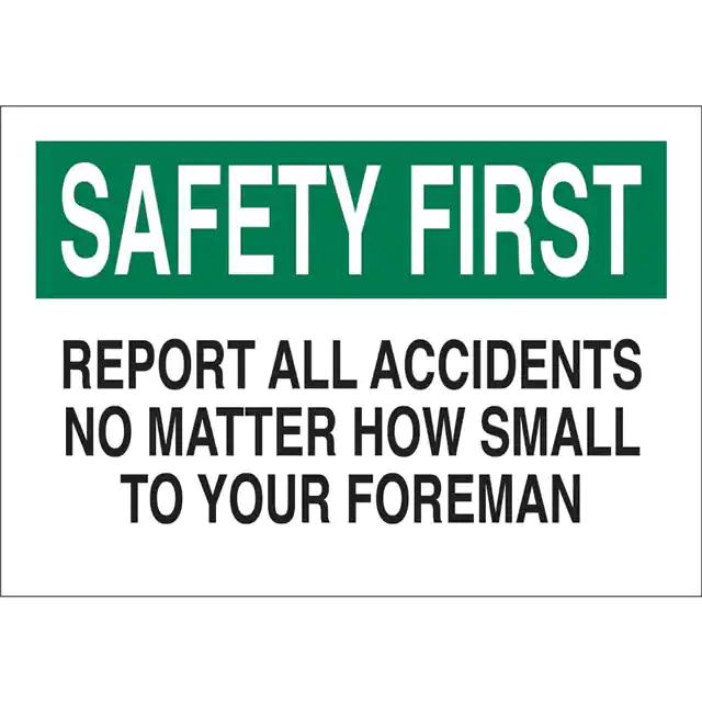 This is manufactured by Brady Corporation. The manufacturer part number is 122722. Label with a size of 14.00" l x 10.00" w (355.6mm x 254.0mm). The product is rohs3 compliant. It is assigned with possible HTSUS value of 3926.90.9985. It is shipped in bulk. It has a classic black and green legend, white background colour. The product brady®, is a highly preferred choice for users. The product is made from highly stable and reliable fiberglass. In addition, it is reach unaffected. Its typical moisture sensitivity level is not applicable. A bespoke label is a safety first. report all accidents no matter how small to your foreman label. The product is suitable for use with warning. It has a long 4 weeks standard lead time. The product is designated with the ear99 code number