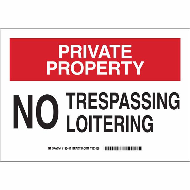 This is manufactured by Brady Corporation. The manufacturer part number is 123467. Label with a size of 14.00" l x 10.00" w (355.6mm x 254.0mm). The product is rohs3 compliant. It is assigned with possible HTSUS value of 3926.90.9985. It is shipped in bulk. It has a classic black and red legend, white background colour. The product brady®, is a highly preferred choice for users. The product is made from highly stable and reliable polyester. In addition, it is reach unaffected. Its typical moisture sensitivity level is not applicable. A bespoke label is a private property. no trespassing loitering label. The product is suitable for use with warning. It has a long 4 weeks standard lead time. The product is designated with the ear99 code number