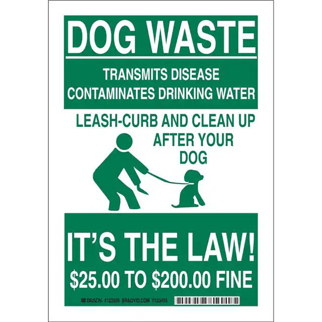 This is manufactured by Brady Corporation. The manufacturer part number is 123560. Label with a size of 14.00" l x 10.00" w (355.6mm x 254.0mm). The product is rohs3 compliant. It is assigned with possible HTSUS value of 8310.00.0000. It is shipped in bulk. It has a classic green legend, white background colour. The product brady®, is a highly preferred choice for users. The product is made from highly stable and reliable aluminum. In addition, it is reach unaffected. Its typical moisture sensitivity level is not applicable. A bespoke label is a dog waste. transmits disease contaminates drinking water leash-curb and clean up after your dog its the law $25.00 to $200.00 … label. The product is suitable for use with notice. It has a long 4 weeks standard lead time. The product is designated with the ear99 code number