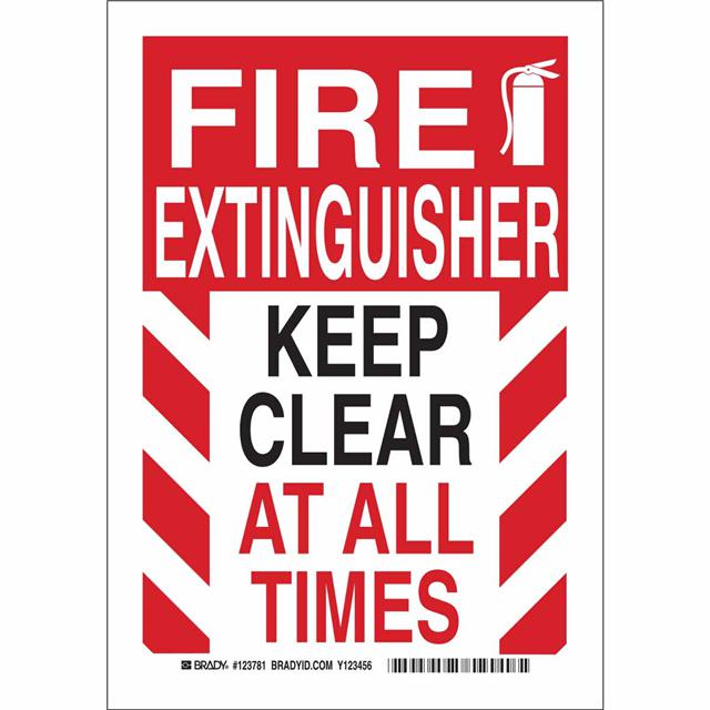 This is manufactured by Brady Corporation. The manufacturer part number is 123782. Label with a size of 14.00" l x 10.00" w (355.6mm x 254.0mm). The product is rohs3 compliant. It is assigned with possible HTSUS value of 8310.00.0000. It is shipped in bulk. It has a classic black and red legend, white background colour. The product brady®, is a highly preferred choice for users. The product is made from highly stable and reliable aluminum. In addition, it is reach unaffected. Its typical moisture sensitivity level is not applicable. A bespoke label is a fire extinguisher keep clear at all times label. The product is suitable for use with fire. It has a long 4 weeks standard lead time. The product is designated with the ear99 code number
