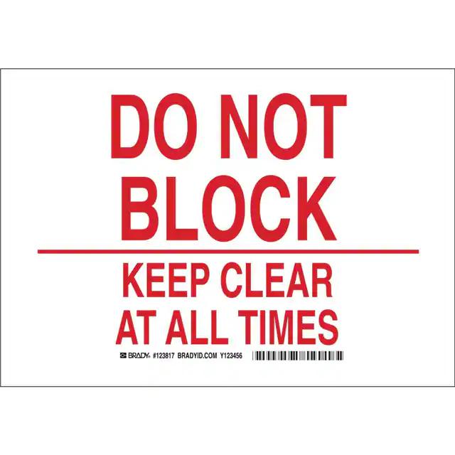 This is manufactured by Brady Corporation. The manufacturer part number is 123818. Label with a size of 14.00" l x 10.00" w (355.6mm x 254.0mm). The product is rohs3 compliant. It is assigned with possible HTSUS value of 8310.00.0000. It is shipped in bulk. It has a classic red legend, white background colour. The product brady®, is a highly preferred choice for users. The product is made from highly stable and reliable aluminum. In addition, it is reach unaffected. Its typical moisture sensitivity level is not applicable. A bespoke label is a do not block keep clear at all times label. The product is suitable for use with warning. It has a long 4 weeks standard lead time. The product is designated with the ear99 code number