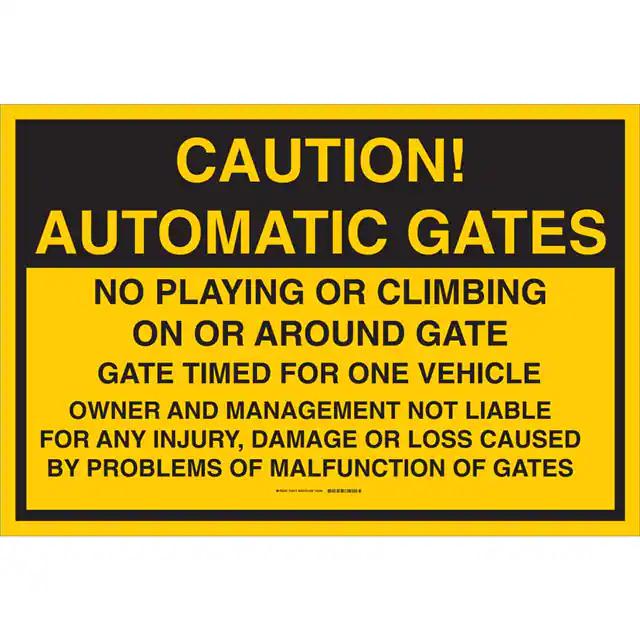 This is manufactured by Brady Corporation. The manufacturer part number is 124273. Label with a size of 36.00" l x 24.00" w (914.4mm x 609.6mm). The product is rohs3 compliant. It is assigned with possible HTSUS value of 3926.90.9985. It is shipped in bulk. It has a classic black legend, yellow background colour. The product brady®, is a highly preferred choice for users. The product is made from highly stable and reliable polyester. In addition, it is reach unaffected. Its typical moisture sensitivity level is not applicable. A bespoke label is a automatic gates no playing or climbing on or around gate. gate timed for one vehicle owner and management not liable for any i… label. The product is suitable for use with warning. It has a long 4 weeks standard lead time. The product is designated with the ear99 code number