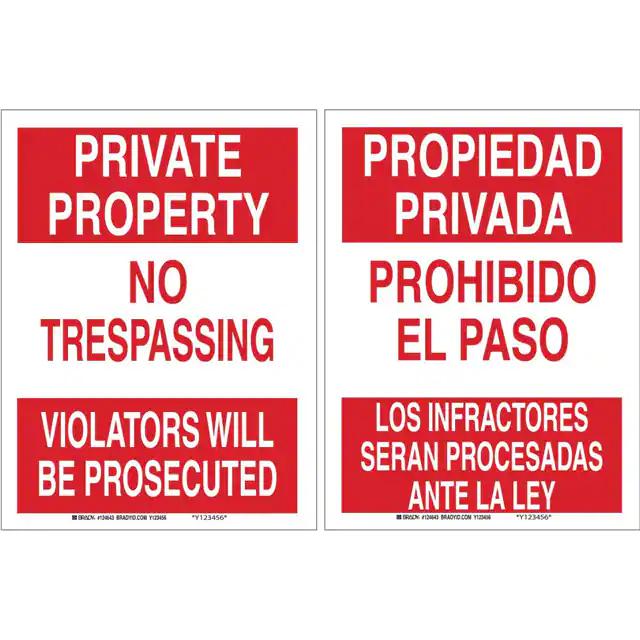 This is manufactured by Brady Corporation. The manufacturer part number is 124645. Label with a size of 24.00" l x 18.00" w (609.6mm x 457.2mm). The product is rohs3 compliant. It is assigned with possible HTSUS value of 8310.00.0000. It is shipped in bulk. It has a classic red legend, white background colour. The product brady®, is a highly preferred choice for users. The product is made from highly stable and reliable aluminum. In addition, it is reach unaffected. Its typical moisture sensitivity level is not applicable. A bespoke label is a no trespassing violators will be prosecuted. prohibdo el paso los infractores seran procesadas ante la ley label. The product is suitable for use with warning. It has a long 4 weeks standard lead time. The product is designated with the ear99 code number