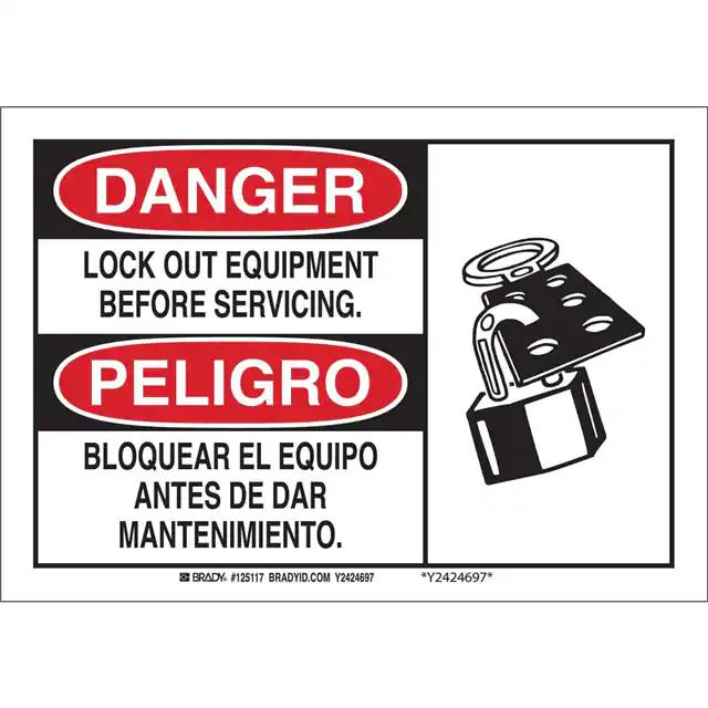 This is manufactured by Brady Corporation. The manufacturer part number is 125118. Label with a size of 14.00" l x 10.00" w (355.6mm x 254.0mm). The product is rohs3 compliant. It is assigned with possible HTSUS value of 8310.00.0000. It is shipped in bulk. It has a classic black and red legend, white background colour. The product brady®, is a highly preferred choice for users. The product is made from highly stable and reliable aluminum. In addition, it is reach unaffected. Its typical moisture sensitivity level is not applicable. A bespoke label is a danger/peligro. lock out equipment before servicing/bloquear el equipo antes de dar mantenimiento label. It has a long 4 weeks standard lead time. The product is designated with the ear99 code number