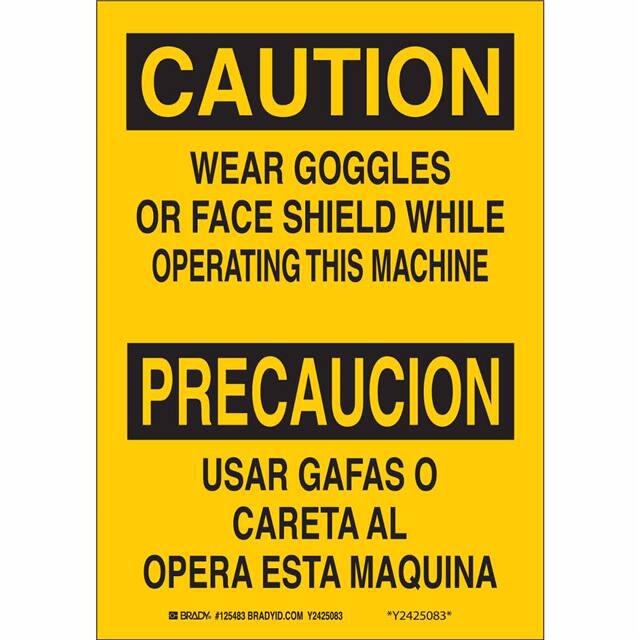 This is manufactured by Brady Corporation. The manufacturer part number is 125484. Label with a size of 14.00" l x 10.00" w (355.6mm x 254.0mm). The product is not applicable. It is assigned with possible HTSUS value of 8310.00.0000. It is shipped in bulk. It has a classic black legend, yellow background colour. The product brady®, is a highly preferred choice for users. The product is made from highly stable and reliable aluminum. In addition, it is reach affected. Its typical moisture sensitivity level is not applicable. A bespoke label is a caution/precaucion. wear goggles or face shield while operating this machine/usar gafas o careta al opera esta maquina label. The product is suitable for use with caution. It has a long 4 weeks standard lead time. The product is designated with the ear99 code number