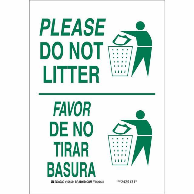 This is manufactured by Brady Corporation. The manufacturer part number is 125532. Label with a size of 14.00" l x 10.00" w (355.6mm x 254.0mm). The product is rohs3 compliant. It is assigned with possible HTSUS value of 8310.00.0000. It is shipped in bulk. It has a classic green legend, white background colour. The product brady®, is a highly preferred choice for users. The product is made from highly stable and reliable aluminum. In addition, it is reach unaffected. Its typical moisture sensitivity level is not applicable. A bespoke label is a please do not litter/favor de no tirar basura label. The product is suitable for use with warning. It has a long 4 weeks standard lead time. The product is designated with the ear99 code number