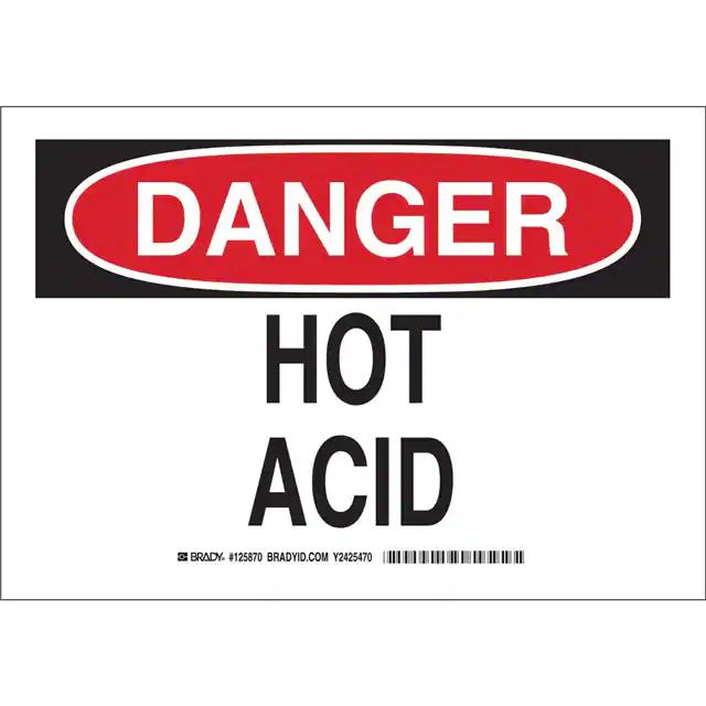 This is manufactured by Brady Corporation. The manufacturer part number is 125871. Label with a size of 14.00" l x 10.00" w (355.6mm x 254.0mm). The product is rohs3 compliant. It is assigned with possible HTSUS value of 8310.00.0000. It is shipped in bulk. It has a classic black and red legend, white background colour. The product brady®, is a highly preferred choice for users. The product is made from highly stable and reliable aluminum. In addition, it is reach unaffected. Its typical moisture sensitivity level is not applicable. A bespoke label is a danger. hot acid label. The product is suitable for use with warning. It has a long 4 weeks standard lead time. The product is designated with the ear99 code number