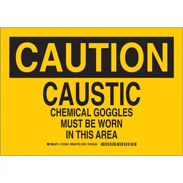 This is manufactured by Brady Corporation. The manufacturer part number is 125925. Label with a size of 14.00" l x 10.00" w (355.6mm x 254.0mm). The product is not applicable. It is assigned with possible HTSUS value of 8310.00.0000. It is shipped in bulk. It has a classic black legend, yellow background colour. The product brady®, is a highly preferred choice for users. The product is made from highly stable and reliable aluminum. In addition, it is reach affected. Its typical moisture sensitivity level is not applicable. A bespoke label is a caution. caustic chemical goggles must be worn in this area label. The product is suitable for use with warning. It has a long 4 weeks standard lead time. The product is designated with the ear99 code number