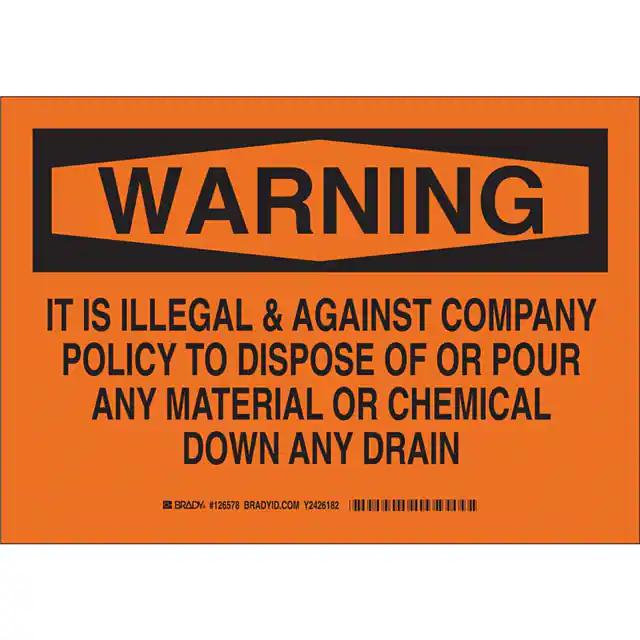 This is manufactured by Brady Corporation. The manufacturer part number is 126581. Label with a size of 14.00" l x 10.00" w (355.6mm x 254.0mm). The product is not applicable. It is assigned with possible HTSUS value of 3926.90.9985. It is shipped in bulk. It has a classic black legend, orange background colour. The product brady®, is a highly preferred choice for users. The product is made from highly stable and reliable polyester. In addition, it is reach unaffected. Its typical moisture sensitivity level is not applicable. A bespoke label is a warning. it is illegal & against company policy to dispose of or pour any material or chemical down any drain label. It has a long 4 weeks standard lead time. The product is designated with the ear99 code number