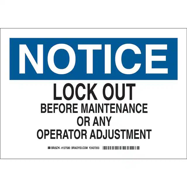This is manufactured by Brady Corporation. The manufacturer part number is 127581. Label with a size of 14.00" l x 10.00" w (355.6mm x 254.0mm). The product is rohs3 compliant. It is assigned with possible HTSUS value of 8310.00.0000. It is shipped in bulk. It has a classic black and blue legend, white background colour. The product brady®, is a highly preferred choice for users. The product is made from highly stable and reliable aluminum. In addition, it is reach unaffected. Its typical moisture sensitivity level is not applicable. A bespoke label is a notice. lock out before maintenance or any operator adjustment label. The product is suitable for use with lock out. It has a long 4 weeks standard lead time. The product is designated with the ear99 code number